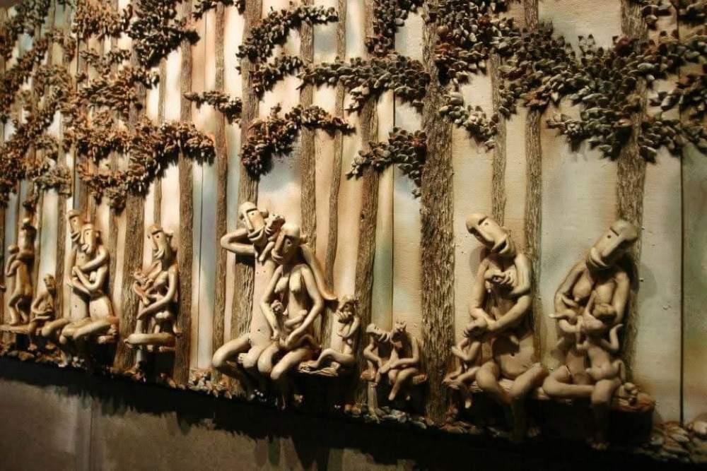 另一處以陶土媒材表現公共藝術規模的作品,是2006年為私人坐月子中心擘劃創作的半浮雕壁畫〈蘋果樹下〉。運用泥條建構搭築的人體形態,線條簡潔,卻以原始質樸又生動的樣貌完整敘事,述說創世紀裡的亞當與夏娃,在另類時空裡—現代版本的完美結局。