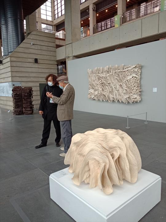 徐永旭 2021-23 2021 高約300cm (經轉載同意,照片取自徐永旭臉書);臺陶獎頒獎當日兩位陶藝家的相會。前景作品:徐永旭 2021-19 2021 88×78×55cm(攝影/杜文田)