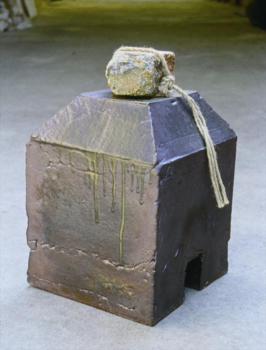 又如1996年臺北縣陶藝美展「景觀雕塑組」獎的〈印記系列〉,此碩大的立體造形由三個部分堆疊而成,底部是有一正圓物件的立方體,中段是缺了一角的鐘形物件,上端則立放了有十字隔線裝飾的多角形陶板;通體表面有深淺不一的印痕、無序的線條刮痕,以及柴燒自然落下的灰釉斑痕,另有三處鑲嵌了青花瓷片。青花瓷片的色澤與紋飾以及右上方的大缺角,成為此如碑、如柱之碩大量體的視覺焦點,彷彿訴說了「文化」才是歷史長河中可以被看見的精彩。而1998年的〈傳說系列二〉,其簡潔不過的外形,像一顆大方印章,表面刻意或者不經意留下自然的裂痕,以及柴燒灰釉自然的布局與灰濛的色調,加上一個綁了麻線的燒磚壓頂,通體散發靜默但深邃的氣氛,看著它,心中好多古老的故事與傳說悄然上演。