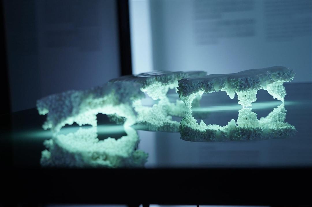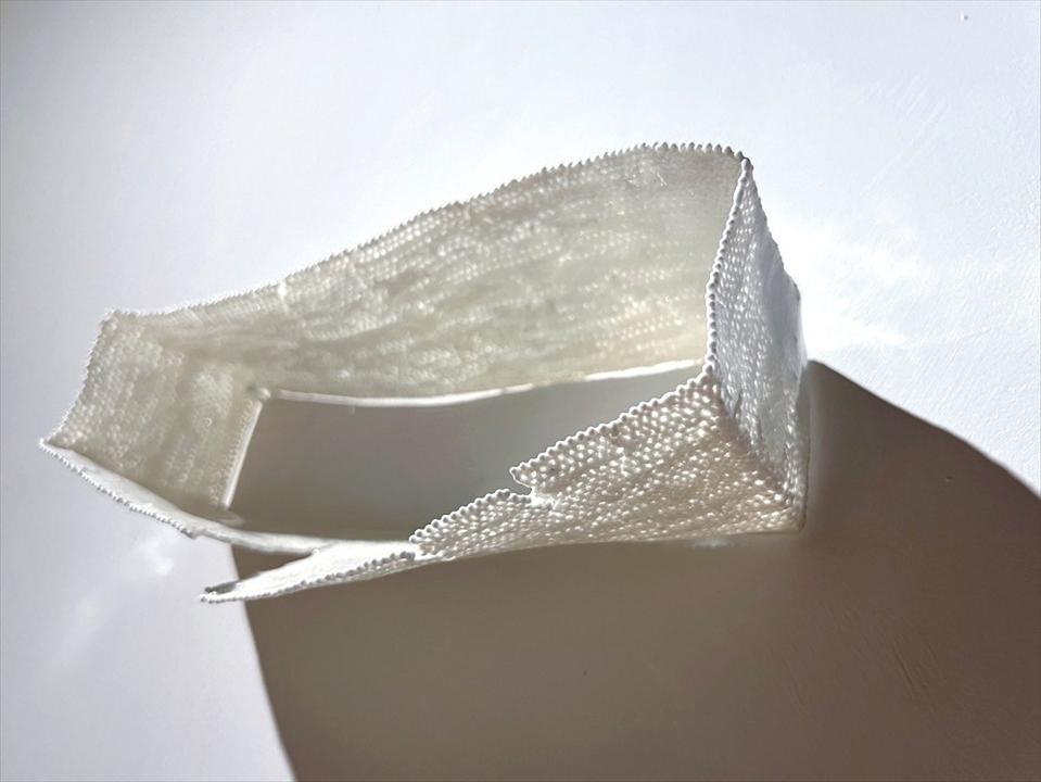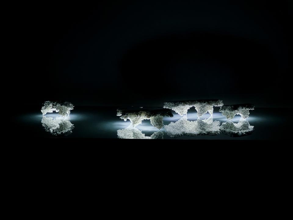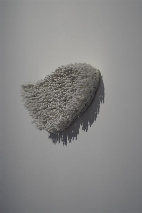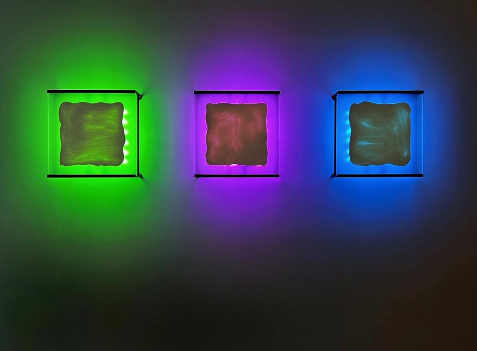 本次展出的〈山〉、〈海〉、〈風〉等三件作品是最佳的呈現,通過創作者設定的特定空間除去既有技法的灌模框架,將泥漿輕薄地依附平面、快速乾燥,於泥漿上勾勒,使瓷土展現出一瞬間動作的記憶。勾勒泥漿剎那所創造的勞動印記,因打燈而清晰顯現,讓觀賞者察覺。這些被創造出的空間包含之不同的流程步驟,經過創作者的操作而銜接,身為作品及創作者外的第三者,肩負著觀者以及成為接收呈報的負責者,接收到了創作者與作品共構出的身體勞動軌跡,這些清晰的軌跡明確地回饋觀者:這是屏除理性的框架所產出的創作物件,搭配了霓虹燈光色的照射,隨著光的若有似無地滲透,襯顯了表面的紋路。