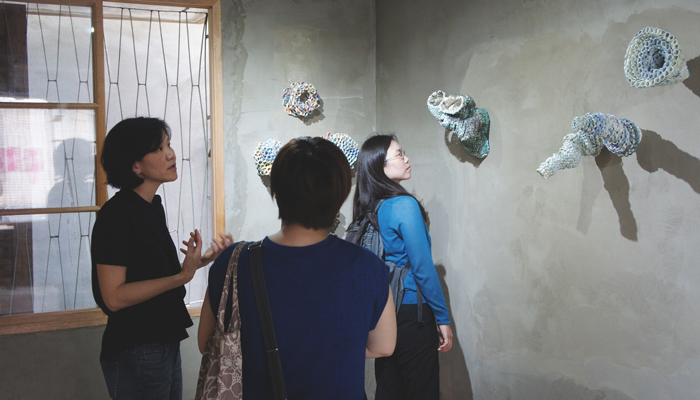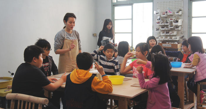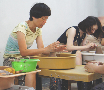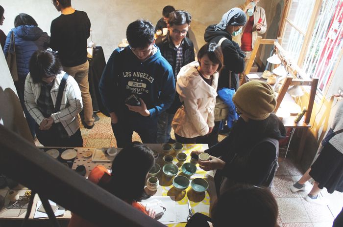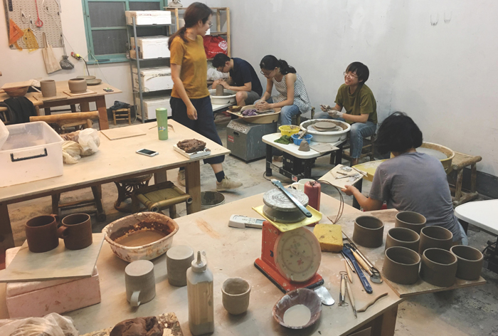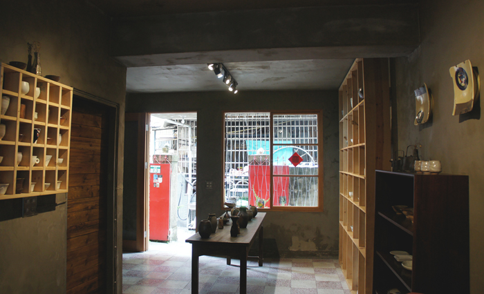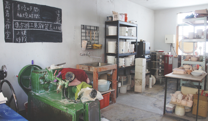 曾就讀台南藝術大學應用藝術研究所陶瓷組的利庭芳,畢業後一直在南部各大院校中教授陶瓷創作課程。因為有感於陶瓷創作的時間長,學生需要練習實作的空間與資源不足且缺乏彈性。在一個意外的緣分下,覓得這處臨近台南孔廟文化園區附近巷弄內的老厝,因而在此創辦了一個結合教學、展覽與銷售的「青青土氣工作室」(以下簡稱青青)。青青,取自於法文「chin chin」,意思是兩個杯子乾杯時發出的撞擊聲;也借用青色的嫩綠、萌芽、年輕之感。土氣兩個字,則是企圖在名字最後回歸陶瓷源於土的本質,亦挪用土器、吐氣的諧音之意。簡單來說,青青是一個生活陶瓷的推廣空間,藉由巷弄內老屋的修繕運用,整理成讓台南在地陶作者展演的舞台。這裡保留許多老屋的細節,將一樓區分為銷售與展覽的兩個區域,二樓則規劃為陶藝課程及學員實作的運用場域,不僅有效發揮機能,更接地氣地呈現出一種既鮮明又樸拙的氛圍。原本青青立足在老房子並非刻意,但有效運用老房子的特色,卻成了一種詩意。這裡的每個區塊空間,都為了讓大家能夠更認識陶瓷、更接近陶瓷、也更喜愛陶瓷。