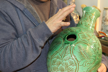唐先生的居家,處處顯示主人的專業,各種造型的壁燈,陶瓷門把,鑲滿壺蓋的牆壁,處處見溫馨,原來陶藝也可以這樣妝點居家環境!最後主人指著玄關處的玻璃燈罩,是家裡的碎玻璃燒成的,太酷了!  一件陶藝作品,用土成形,再施以釉藥,經過高溫窯燒之後完成。土有白、黃、棕、黑,所以胎可以單色,也可以二種以上的土,變成有紋路的絞胎 ; 釉色變化更是多變,最後的燒成氣氛決定氧化/還原,顏色有更多變化。土、釉、火看似分開的三樣元素,經過藝術家的手,產生結合,其中的千變萬化,卻需要經驗與智慧才能掌握,絕非一句窯變就可以唐塞。 土方面來說,唐國樑非常講究土的材料,例如一款製作煮水茶壺,不上釉,可放在炭火上煮沸持溫,泡出來的茶特別好喝,是花了好一番工夫才找到的。釉藥更是下足功夫,不斷做試片,找尋新釉色,使唐國樑作品一直不斷有新創作出現。 唐國樑主修雕塑,對立體空間的敏感度非常高,除了餐茶具,也會做花器,他的花器結合雕塑造型,令人有意想不到的造型。遷居三芝後,大量使用貝殼做基本造型。他運用部分上釉,部分不上釉,展現表面肌理的衝突,凸顯主題。有些花器運用卡榫,將兩個物件結合在一起,十分有創意。 在唐國樑的展示間,會看到生活陶藝的多樣性,陶藝作品有趣的變化,妝點居家生活環境,享受生活樂趣,陶藝和生活緊密地結合在一起!  |
