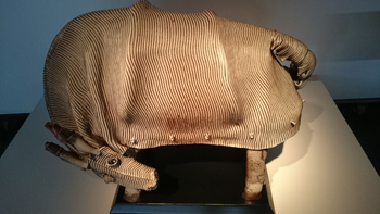 踏入陶博館三樓偌大的展區內,首先可以看到主辦單位別具用心根據不同主題所呈現出各異其趣的展區風格,如蘇州庭園,北海道花海與日式中庭等造景配置。在豐富各異的128件展品中也根據作品及主題的關聯性分類並穿插説明文字。在「探索自然」展廳中所要呈現的主要是多元主題的想像並陳;「運用自然」展區內著重於技術與媒材的多樣化靈巧運用;「再現自然」展區裡提供各種造形與景觀的轉化及觀照;「關懷自然」則是把目光拉回到文化、環境與創作之間的相互呼應關係上。敘述至此,相信大家已然發現本次的展覽主題「陶最自然」試圖表達的是「陶是將自然元素最極致運用的一種再創造形式」與「陶也是可以將自然與文化脈絡再現的一種表現方法」。  |  | | 簡單 - 曾愛真 | 蕉葉馬 - 鄭永國 | 綜觀整體來說,此展的意圖與呈現方式時有諸多違和與牽強之處。首先是「自然」的主題表現,陶藝作品取之於自然元素,並運用自然元素創造而出不假。但強調自然卻沒有將自然的氛圍和精神凸顯,卻是一大令人困惑不解之處。尤其是先前強調的展場造景與作品搭配,更是一大諷刺與矛盾,將人工製造的一切用「最」自然來框架與媒合,似乎未達至極之最,反有自我陶醉之嫌。不可諱言地,本次展覽的確是將陶博館歷年來的典藏精品精銳盡出,讓民眾可以一次飽覽這些多樣豐富且各異其趣的經典佳作。但是強加附會的分類與詮釋,反倒使得作品各自的創作精神和內涵逸趣有標籤強加後的失焦和牽強,略有為賦新辭強說愁的勉強感。  |  |  | | 失落的尊嚴 - 李永明 | 核子劇場-蘭嶼夜曲 - 吳建福 | 作者 張山 | 舉例來說,「探索自然」中要表達是陶藝器型的實用摸索昇華,亦或是抽象幻想下的型態抽離表現呢?如此的系統性失焦與模糊,猶如在迷霧中再撒上一把煙塵。而「運用自然」中的技術巧思與媒材介紹,與其說是運用自然,還不如說是掌握自然運用的脈絡,超越自然的靈活表現更為貼切。而「再現自然」裡的擬真創作,似乎已和再現自然的意涵劃上等號。但「擬真=再現」?或者這只是一種模仿?如果陶藝的擬真等於自然的再現,那生活中的水泥或塑膠模擬木造圍籬造景是否也可以說是一種再現自然的表現呢?強加附會藝術家對創作題材的擷取意圖,只會讓創作本身更深一層的言外之意在分類中被框架與曲解而已。那所謂的「關懷自然」省思,也只會因此而更加深對創作與自然間的一廂情願誤讀罷了。樂觀來說,拋下「陶最自然」的主題,單純欣賞本次的128件典藏精品,這仍是一場非常值得觀賞的陶藝特展。但強加附會主題和策展內容卻讓這個展覽的多元豐富,與觀眾欣賞時的自由想像,多了一層不必要的牽強框架。就如同一場美術館的典藏畫展被貼上「畫最真實」或「畫最好看」的標籤一樣。「自然」在此展中顯得多餘且「不」自然。大大方方地將陶博館經典藏特展,依時間年代、依創作形式類別或依大小媒材來分類都或許能更達到效果。筆者在觀展當日順道參觀了館內兩個規模較小的主題特展「顫動的生命之火─涂慶賀陶藝個展」與「土神祭聲之巫─杜爾陶藝個展」,觀後即認為兩展規模雖然不如「陶最自然」特展的規模宏大,但主題與作品之間的聯結明確,在小小的展區中具體的將創作者與展品精神達到分享給大眾的效果。尤其是在「土神祭聲之巫─杜爾陶藝個展」中,那鮮明的作品風格、展場佈置和文化主題之間達到引人入勝且可深可淺的觀展效果。這或許才是觀眾來到博物館走馬看花之餘,最有可能留下印象與學習認知等效果的初衷吧!否則「陶最自然」不僅不能彰顯自然,更像是逃避現實下,將策展熱情自我陶醉下的花火自燃,絢麗過後,短暫即逝的「逃醉自然」。  |  | | 土神祭聲之巫─杜爾陶藝個展 | 顫動的生命之火─涂慶賀陶藝個展 | |