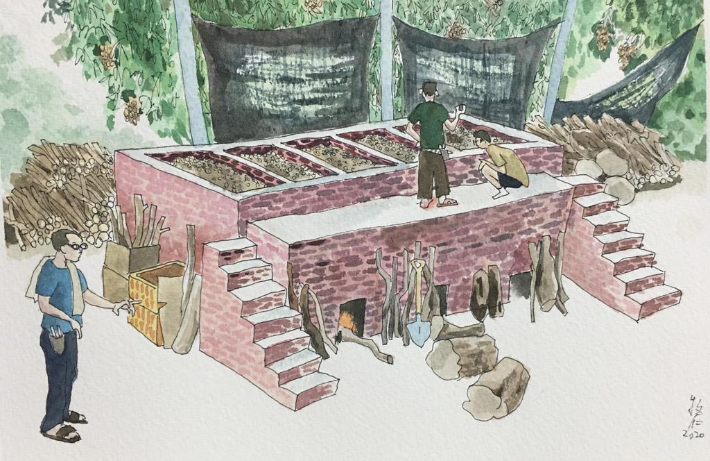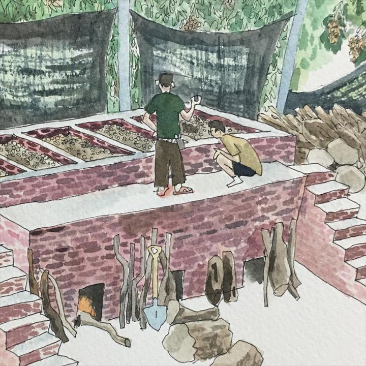 我爬上樓梯,看到一格一格的凹槽,裏面滿滿的龍眼,藉著窯體散出的熱氣,龍眼果肉的含水量會逐漸減少。主人隨手剝了一個讓我試吃。他說還要再烘個三天三夜,才能完工。我想在現場描繪這個窯體,但主人必須繼續他原本整理龍眼的工作,要我自己慢慢看,臨走之前叮嚀,站在高台上要注意安全。我問他有無龍眼乾可販售,他說要再一個月才有大量的龍眼乾成品,不過,現場的半成品是可以吃的,「儘管從窯裡拿去吃!別客氣,吃的數量有限啦!」