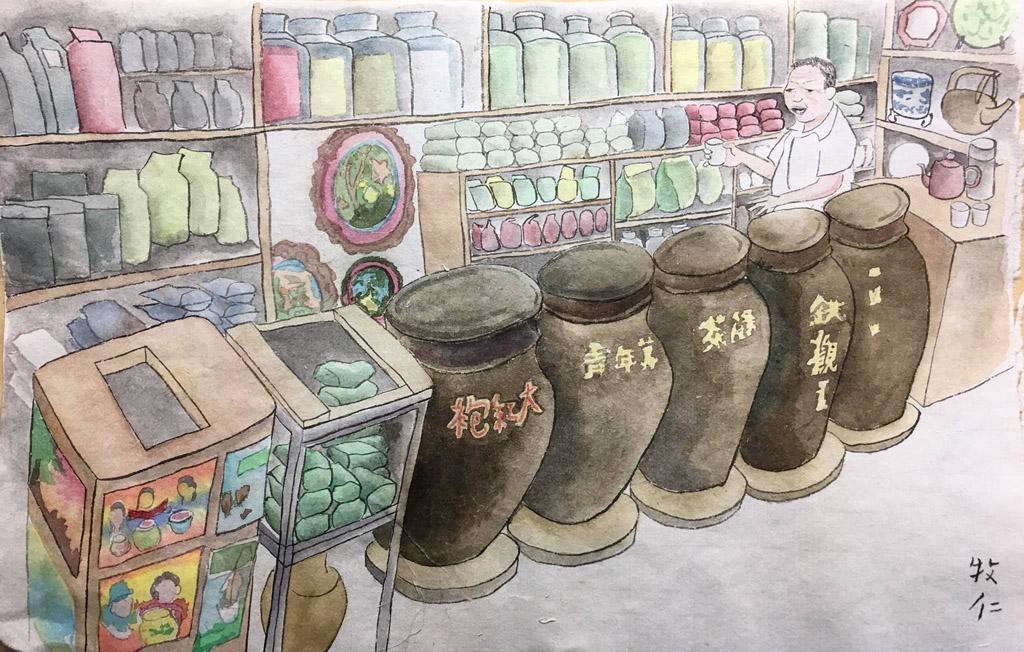 走到台南新美街上,偶遇一家茶行,店門口櫥櫃貼滿了樸拙的畫作。仔細欣賞,內容盡是一些茶葉相關的圖案,有各種茶葉的介紹、茶湯的沖泡方式、各式茶具描繪等,圖案色彩繽紛,充滿感情,感受得到繪者的創作能量及熱忱。正當看得出神,耳邊傳來一聲「呷茶!」的招呼聲。理著整齊平頭,身穿白襯衫,微胖的臉上堆著笑容與細細的皺紋,他是茶行主人,也是畫作的創作者。他不單是穩健經營著祖傳百年茶行的茶葉專家,也是位藝術愛好者。他指著我身上的相機說:「我年輕時也是像你這樣背著相機到處跑,到處看。」他回想以前收購茶葉,都要在現場監工,以防製茶過程茶葉被調包。台灣各處茶區他都去,南投、台東、台北都有他的足跡,每次選好茶葉,就在當地看茶農製茶,每回都要待上好幾天,一有空檔就四處拍照或畫圖,享受創作樂趣。他笑笑說,倒是很少人注意到他的作品,大部分客人的注意力都被放在店裡的那幾尊裝茶葉的老陶甕給吸引了。老陶甕是清朝時由中國運來的,每尊都是百年歷史。我問他用這老甕儲存茶葉有特別用意嗎?老闆掀起了陶甕厚重的蓋子讓我ㄧ瞧,裡頭存放ㄧ包包的茶葉。原來,茶葉存放於甕內可避免受潮,而厚厚的陶坯阻絕了夏日的高溫,這樣的儲存空間像是簡易版的乾燥箱,濕度及溫度變化不至太劇烈。早期包裝技術不如現在,陶甕儲存茶葉效果佳,對老茶行的重要性非同小可,可算是鎮店之寶。而這些大陶甕原本有上百個,可惜在二戰期間台南遭受盟軍轟炸,茶行房舍受損嚴重,陶甕跟著破損了大半,只剩店裡這幾個。聽了老闆這麼具時代感的說明,令人對眼前的大陶甕更加深深著迷。