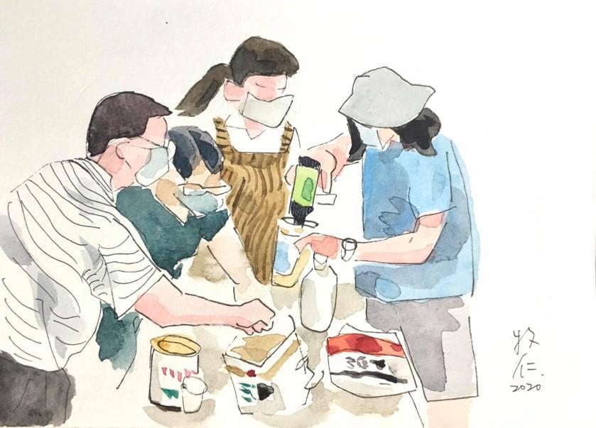 實作過程中,大家邊做邊說笑,白色水泥漆像胃乳,調好的補土漆則像優格……有人則談到,黃土這材料好像在一些油漆行慢慢消失,但普遍來說,郊區的油漆行裡都還容易買到黃土,都市裡的油漆行則跑了好幾家才找到,老闆還會好奇詢問買黃土的用途。