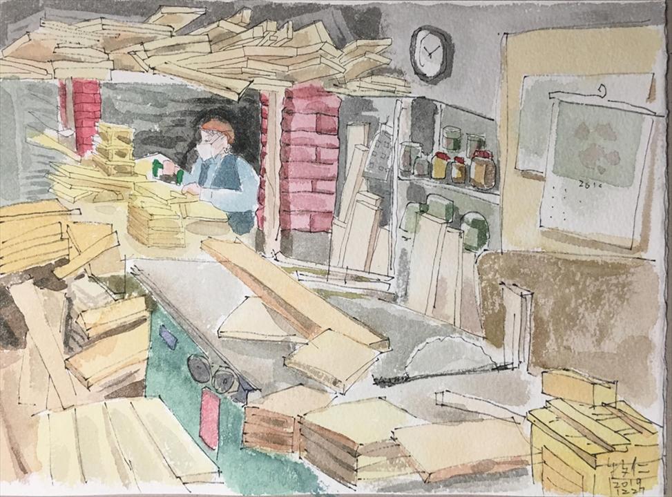 來到木材工廠,聞著木頭香味,看到木工師傅正在木材堆中趕工,滿是木屑的空間,傳來「達達達」的釘槍聲,ㄧ個個放置小陶器的木格架陸續完成,地上還有幾個像安全帽大小的木箱,師傅說那是客人訂作來包裝外銷茶壺。精緻的茶壺躺在木箱裡,安穩地坐船到世界另一角落。你有什麼需要,這裡的師傅都會幫你設計製作!老屋延伸搭蓋成的工寮,透出溫暖的燈光,這家木材廠ㄧ直是鶯歌陶瓷工作者重要的夥伴。