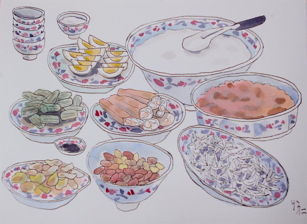 那幾天早上起床,我發現餐桌上的早餐不一樣了,媽媽把家裡所有的瓷器餐具都搬了出來,大碗公裝著剛熬好的熱騰騰稀飯。大菜盤裝肉鬆,腰子盤裡有吻仔魚,大小圓盤裝了麵筋、花瓜等下飯的醬菜,小碗公裡的花生米咬起來香噴噴,滷蛋也被切割整齊地擺放在專有盤子裡。媽媽還特地去買了油條,切成一段段,配上稀飯吃,美味極了。連裝沾油條的醬油,也有個專屬的小瓷盤呢!姑姑們一直稱讚媽媽的好手藝,那頓早餐我吃得好開心,原來在家吃飯也可以像在餐廳一樣氣派。客人離開後,我家又恢復成稀飯起鍋就上桌,罐頭直接開來吃,滷蛋直接整顆放在每個人的飯碗裡,塑膠袋裝花生......的用餐習慣。那些瓷盤全被媽媽收回櫃子裡了。