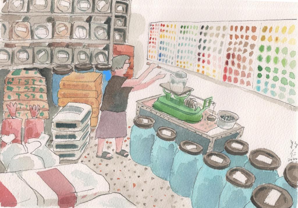 所有陶瓷專用配土或配釉的原料,都可在這家化工原料老店找到,只要跟店家說明你要的品項和數量,熟練的工作人員,馬上從牆邊的膠桶或是架上的鐵盒,取出原料裝進袋子過磅,再迅速用橡皮筋綑綁袋口。過程快速有節奏,毫無疏漏。就像技術高超的拉坯師傅,不會讓轆轤上的泥漿四處飛濺。店裡即使擺滿了各種粉狀原料,始終保持工作檯和地面一塵不染。